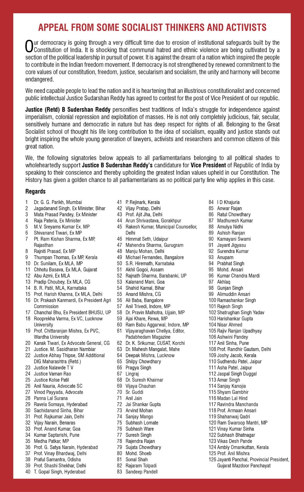 ऐसे संकट काल में हम हिंदुस्तान के समाजवादी जो महात्मा गांधी, आचार्य नरेंद्र देव, युसूफ मेहरअली, जयप्रकाश नारायण, कमला देवी चट्टोपाध्याय, डॉ राममनोहर लोहिया से प्रेरणा लेते हैं, आपसे अपील करते हैं कि आप इंडिया ब्लॉक के उम्मीदवार जस्टिस बी सुदर्शन रेड्डी को विजयी बनाकर लोकतंत्र के पक्ष में तथा सांप्रदायिक, तानाशाही को शिकस्त दें।