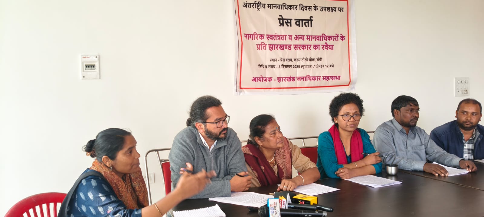 अंतर्राष्ट्रीय मानवाधिकार दिवस (10 दिसम्बर) के उपलक्ष्य में झारखंड जनाधिकार महासभा ने आज प्रेस वार्ता का आयोजन कर पिछले एक साल के कई तथ्यान्वेषणों व जांच के आधार पर लगातार हो रहे मानवाधिकार उल्लंघनों के मामलों को प्रस्तुत किया। जहां एक ओर मोदी सरकार नागरिक स्वतंत्रता के अधिकारों को खतम कर रही है, वहीं दूसरी ओर हेमंत सोरेन सरकार इन अधिकारों के प्रति अत्यंत उदासीन है। आदिवासी, दलित, मुसलमान और गरीब दैनिक पुलिसिया दमन और लचर न्यायिक व्यवस्था से त्रस्त हैं।