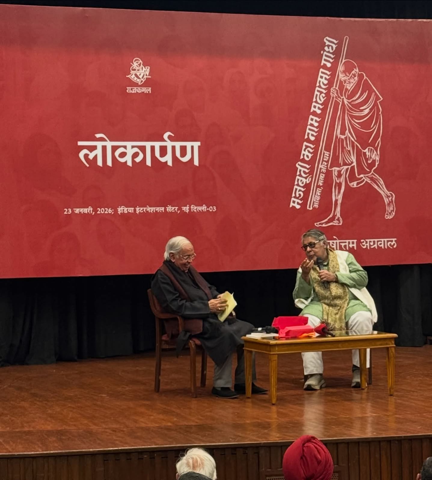 देने वाली ठंडी हवाओं के मौसम में ज्यादातर लोग अपने घरों में दुबके हुए थे वहीं इस लोकार्पण समारोह में खचाखच भीड़ थी । समारोह की शुरुआत प्रसिद्ध गायिका शुभा मुद्गल की होनहार शिष्या शिवांगिनी के मीरा और कबीर के पदों के बखूबी गायन से हुई। आखिर में जब उन्होंने गांधी जी के प्रिय भजन * वैष्णव जन तो तेने कहिए* को एक अलग और खास अंदाज में पेश किया तो पूरा सभागार गांधीमय हो गया। इस समारोह के मुख्य आकर्षण में जहां प्रोफेसर पुरुषोत्तम अग्रवाल की लोकार्पित की जाने वाली बहु प्रतीक्षित पुस्तक *मजबूती का नाम महात्मा गांधी* था, वहीं एक और बड़ा आकर्षण गांधी जी के पोते राजमोहन गांधी का अभूतपूर्व और आँखें खोल देने वाला वक्तव्य था। वे स्वास्थ्य कारणों से सभागार में नहीं आ सके लेकिन ऑनलाइन ही उन्होंने अपने संबोधन में यह चिंता जाहिर की कि देश में हिंदू मुस्लिम एकता के साथ दलित और महिलाओं पर हमले लगातार बढ़ रहे हैं। इसी के साथ उन्होंने यह भी कहा कि इन दिनों तीन झूठ देश में बड़े जोर-जोर से फैलाए जा रहे हैं। पहला, बड़े पैमाने पर विदेशी मुसलमान भारत में घुस आएं हैं , दूसरा, बड़ी संख्या में धर्मांतरण हो रहा है और तीसरा झूठ कि गांधी जी ने विभाजन का कभी विरोध नहीं किया। इन तीन झूठी बातों को फैलाने के कारण हमारी वसुधैव